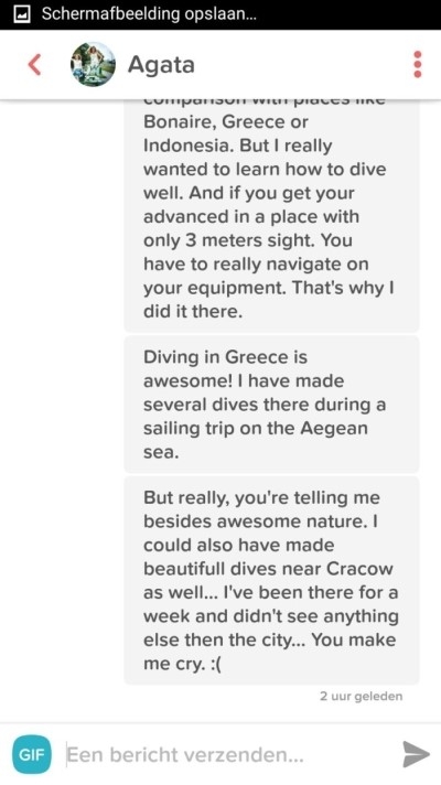 Een Tindermatch vraagt aan deze man of hij duikt.