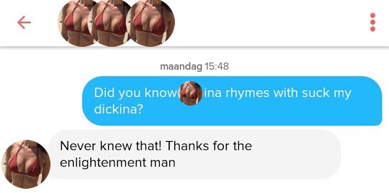 Waarschuwing: Het onderstaande gesprek dat je gaat zien, is geen standaard lief politiek correct Tinder gesprek. Mijn grappen zijn op het randje, mijn flirtzinnen zijn over the top, en mijn tips brengen haar onder je lakens. Je bent gewaarschuwd.