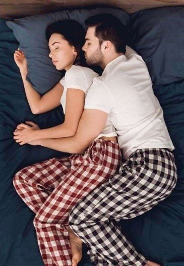 In 90% van de gevallen ligt de man achteraan. Als een warme muur geeft hij zijn vriendin een veilig gevoel.