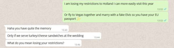 “Or fly to Vegas and get married with a fake Elvis so you have your EU passport”